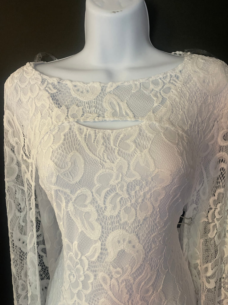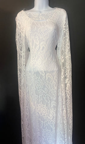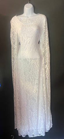 long lacey stretchy material dress with cape. Is a 3k cut runs big